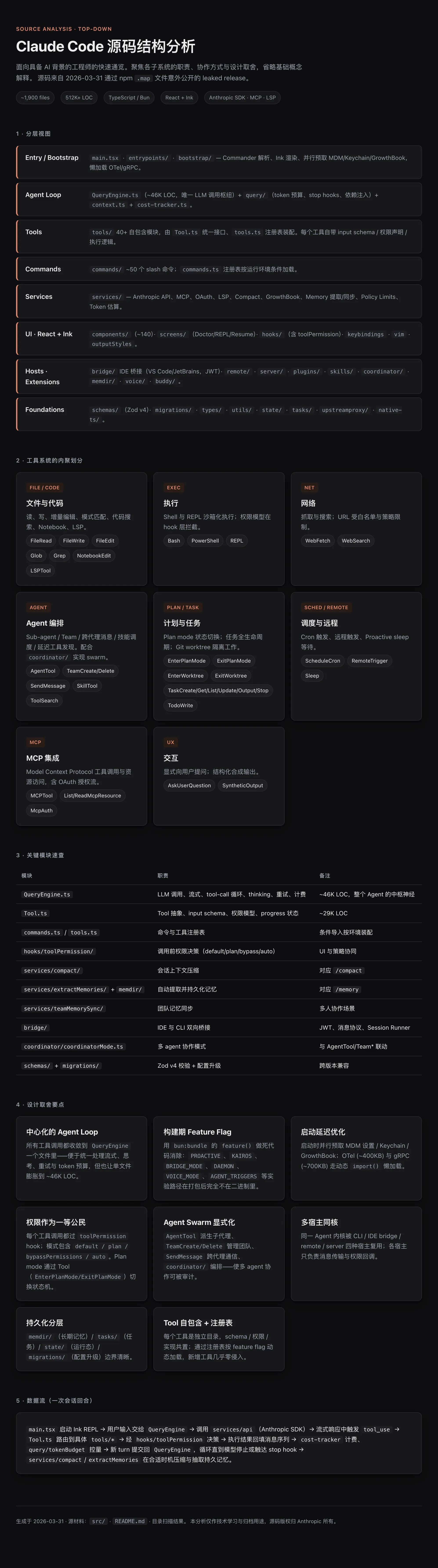 QueryEngine.ts(~46K 行)为唯一的 LLM 调用枢纽,所有工具调用、思考、流式、重试逻辑都汇聚于此。 - 工具即模块: